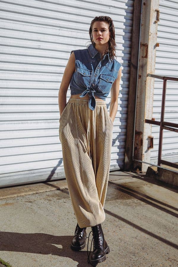 A washed waffle knit jogger pant featuring elasticized waist with front tie and side pockets. Matching top FT1061