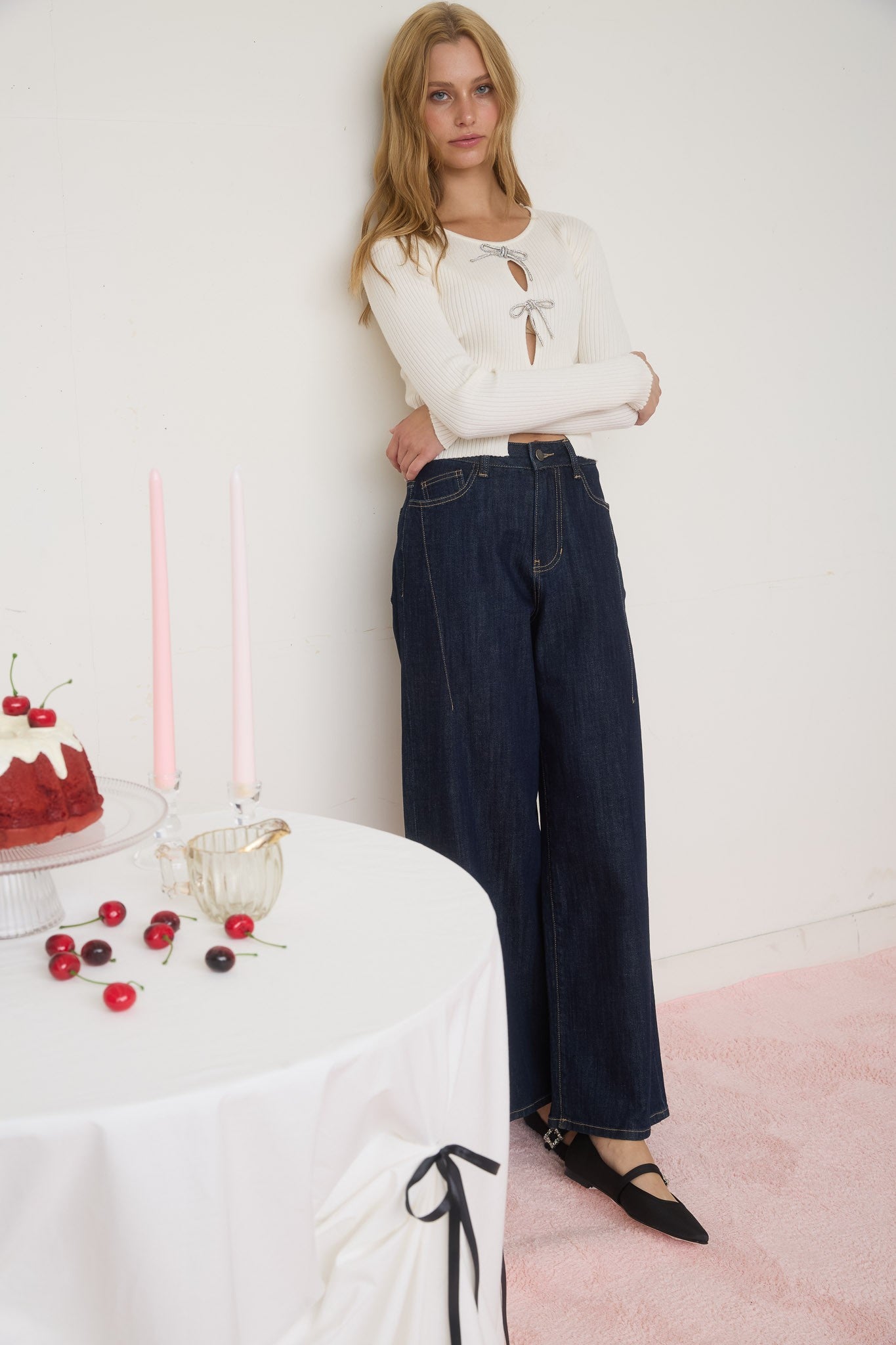 The Bella Top is your go-to piece for effortless elegance with a playful twist. This fitted knit long sleeve top features a charming round neckline and strategic cut-out details that add modern flair. Finished with shimmering rhinestone bow accents, it's the perfect blend of sophistication and fun. Crafted in a versatile cream hue, this top pairs beautifully with everything from jeans to skirts, making it an instant wardrobe favorite for any occasion.