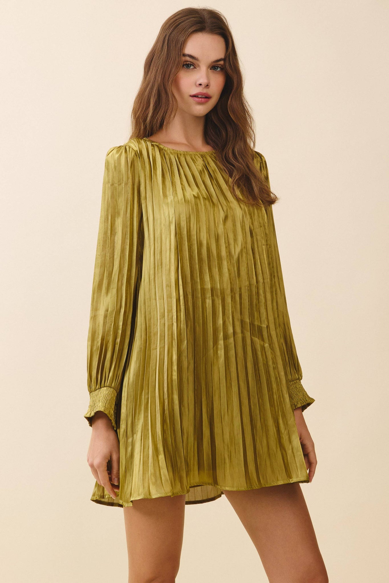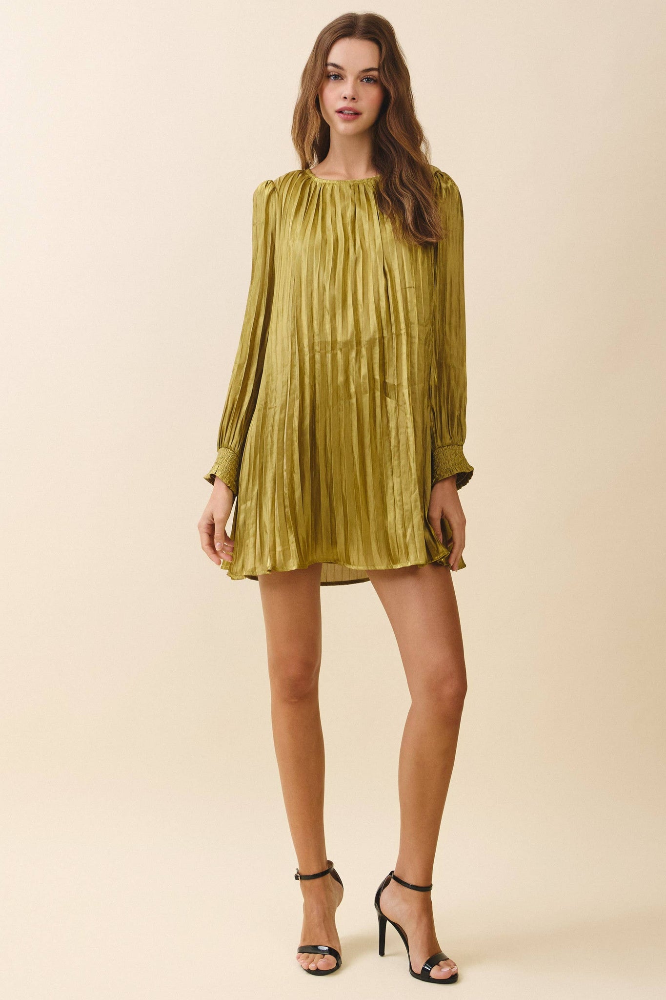 Elevate your holiday look with this stunning metallic pleated mini dress! The relaxed A-line silhouette flatters every figure, while long sleeves with smocked cuffs add a touch of sophistication. A charming round neckline and back keyhole button closure complete the design. Whether you're heading to a festive party or a special celebration, this dress shines in both olive and red. Perfect for making a memorable entrance!