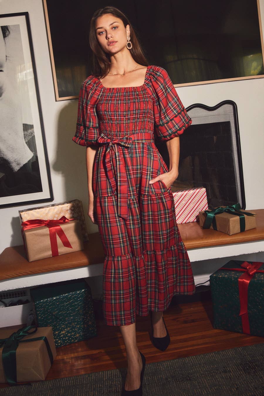 Smocked plaid midi dress with square neckline, tiered skirt and puff sleeves. Also available in sizes 1XL to 3XL: Style no. ID18911P. Total Length: 49" Self: 100% Polyester, Cont:97% Polyester, 3% Spandex