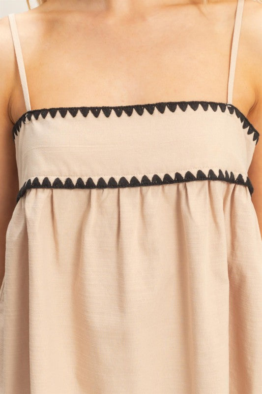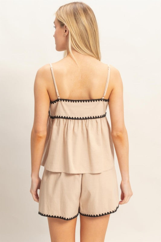 The Amelia Set is your go-to choice for effortless summer style. This two-piece ensemble features a sleeveless baby doll top paired with matching shorts, both accented with striking black stitching details that add a touch of sophistication. The relaxed silhouette keeps you cool and comfortable, while the thoughtful design elements elevate your casual look.. Light, breezy, and undeniably chic.