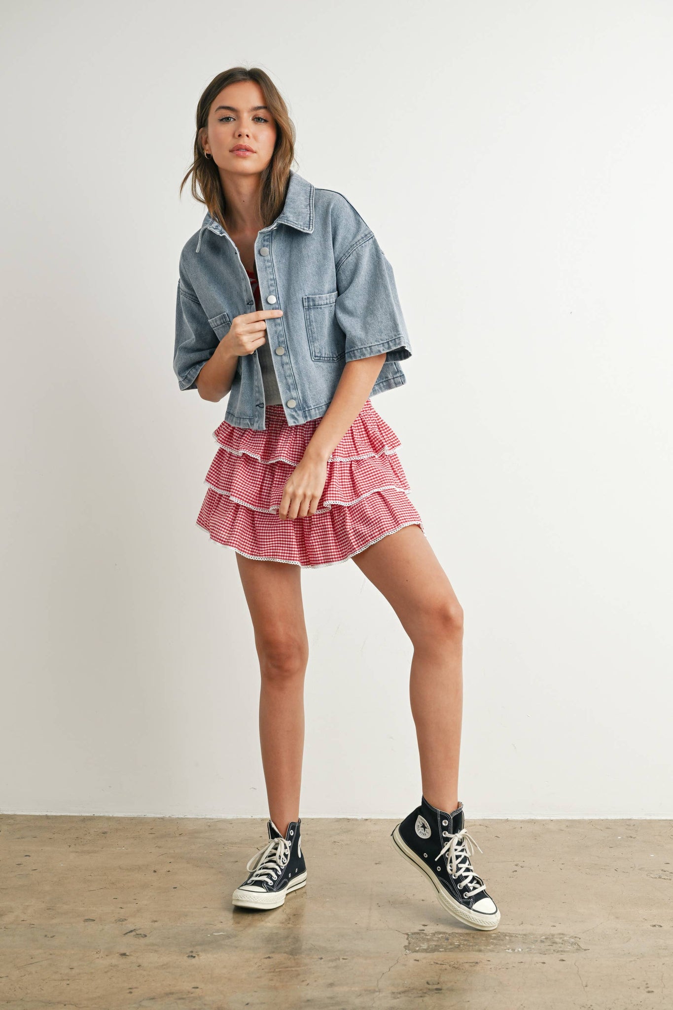 Elevate your wardrobe with the Avery Denim Top, the perfect blend of classic charm and contemporary flair. Featuring a tailored fit and button-down detailing, this versatile piece pairs effortlessly with high-waisted bottoms for a polished yet relaxed vibe. Lightweight and breathable, it's your ultimate staple for chic, everyday styling.