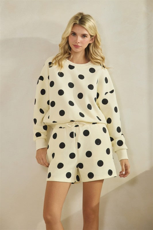 Experience the perfect blend of comfort and style with our Chloe Shorts! These adorable, loose-fit sweat shorts, adorned with charming black polka dots on a creamy backdrop, feature handy pockets and an adjustable drawstring for the ideal fit. Pair them with the matching Chloe sweatshirt for a complete look that radiates cozy chic!