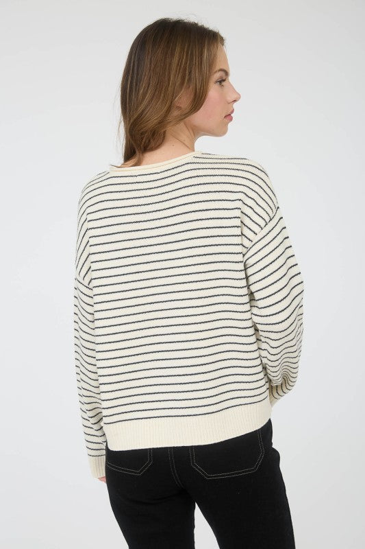 Stay cozy and stylish in the Erica Cardigan! This striped button-down knit cardigan in cream and black is both classic and comfortable. Its raw edges add a touch of edginess, making it perfect for any occasion.