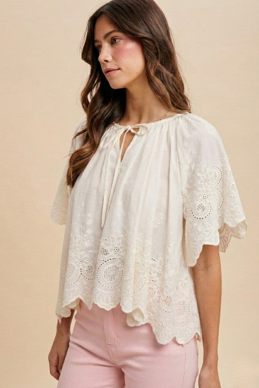 The Farrah Blouse captures romantic elegance in a pristine ivory hue, featuring delicate eyelet lace embroidery that adds intricate texture and timeless charm. Its breezy, flowy silhouette with fluttery short sleeves, a sweet front tie-neck detail, and a scalloped hem creates an effortlessly feminine look that's both airy and sophisticated. Perfect for warm days or dressed-up occasions, pair it with high-waisted pants or skirts to highlight its cropped, flattering fit and boho-inspired allure. This standout piece brings a touch of dreamy femininity to your wardrobe—soft, lightweight, and utterly irresistible, you'll find yourself reaching for it time and time again!