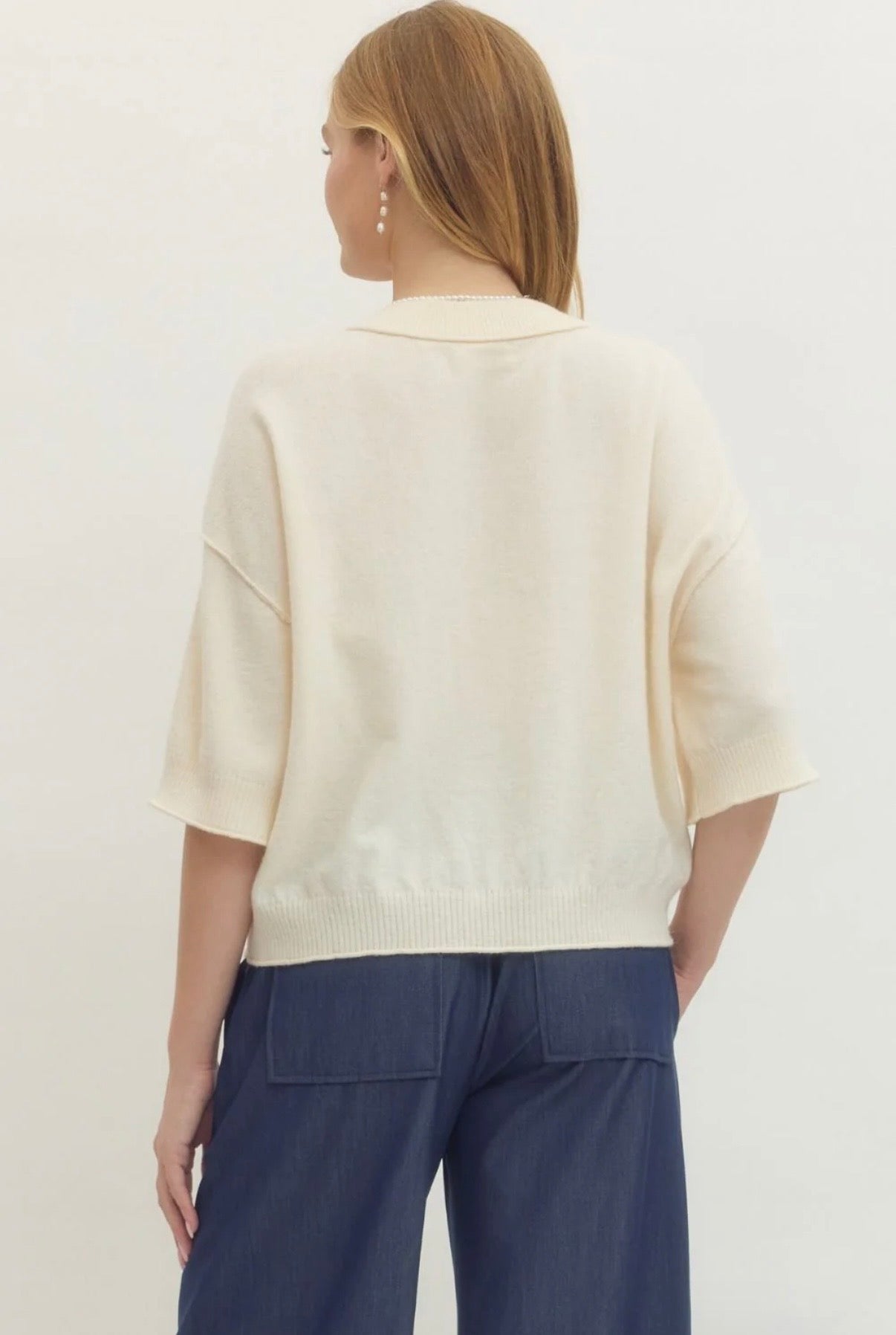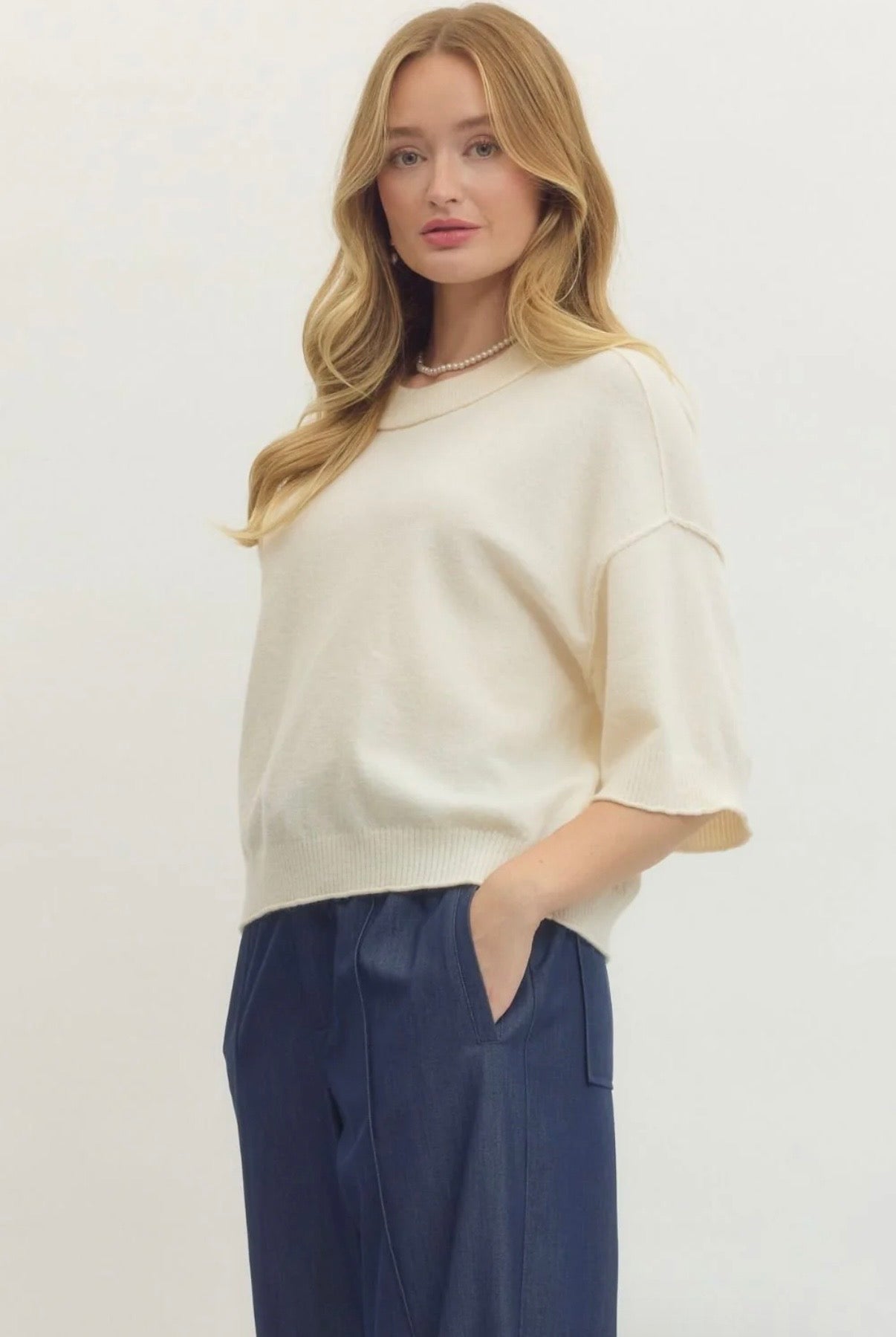 The Kayla Sweater Top elevates everyday luxury with its ultra-soft cashmere knit in a timeless cream shade that exudes effortless elegance. This oversized cropped silhouette features a classic crew neck, relaxed short sleeves with subtle dropped shoulders, and a cozy ribbed hem that adds refined detail while keeping the look modern and cropped for perfect proportion. Pair it with high-waisted trousers or your favorite denim for an instantly polished, sophisticated vibe that's comfortable enough for all-day wear yet chic enough to turn heads. Indulge in the buttery softness and versatile style that makes this an irresistible wardrobe staple you'll love reaching for season after season!