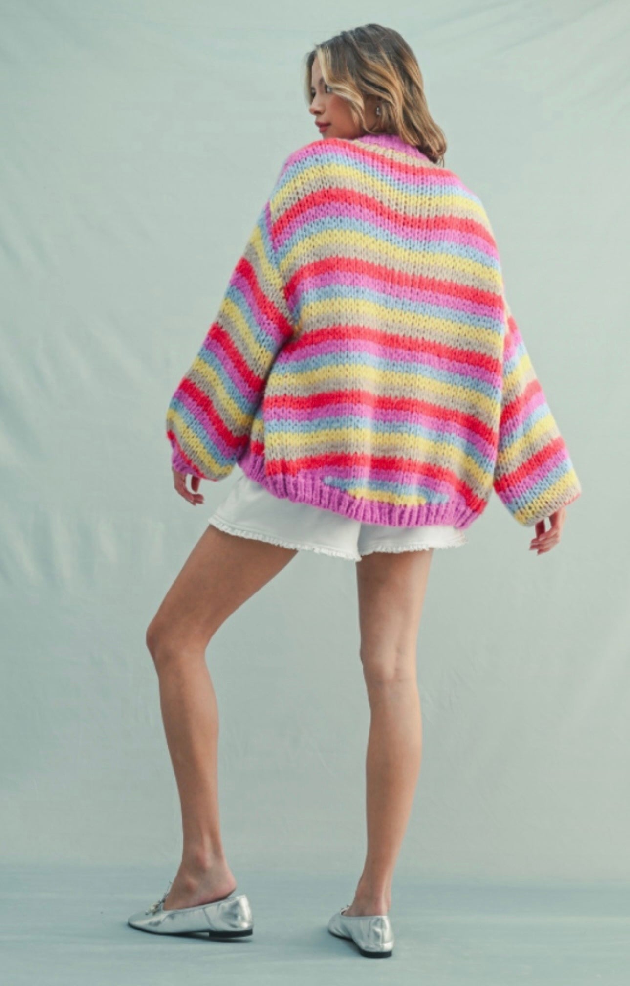 The Peyton Cardigan is your ticket to turning heads with its bold, eye-catching striped design. Featuring vibrant bands of magenta, red, taupe, yellow, and sky blue, this cozy knit piece brings instant personality to any outfit. The playful balloon sleeves add a fun, contemporary twist that elevates your everyday style. Perfect for layering over basics, this cardigan is the colorful statement piece your wardrobe's been waiting for.