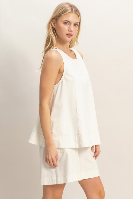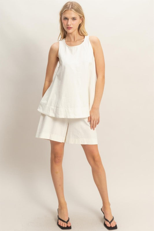 The Selah Set features a sleeveless A-line top paired with coordinating shorts, crafted from soft, breathable fabric. Perfect for warm weather styling, this two-piece set offers effortless comfort and versatile appeal. The relaxed fit and gentle drape make it ideal for casual outings or relaxed days at home.
