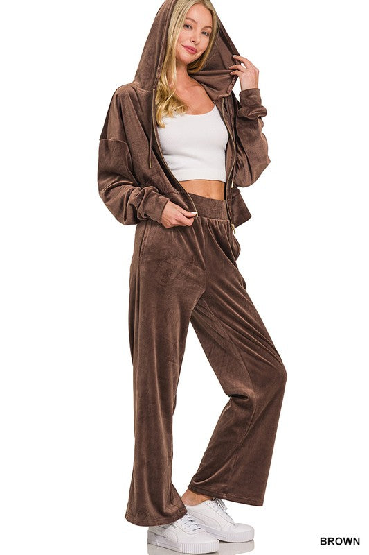 The Victoria Velvet Set brings cozy glamour to your wardrobe with its sumptuous brown velvet construction. This luxe two-piece set pairs beautifully for layered styling or worn separately for versatile everyday wear. The soft, touchable fabric drapes elegantly while the rich chocolate tone complements any complexion. Perfect for elevating casual moments or creating effortless sophistication. Indulge in velvet comfort that feels as good as it looks.