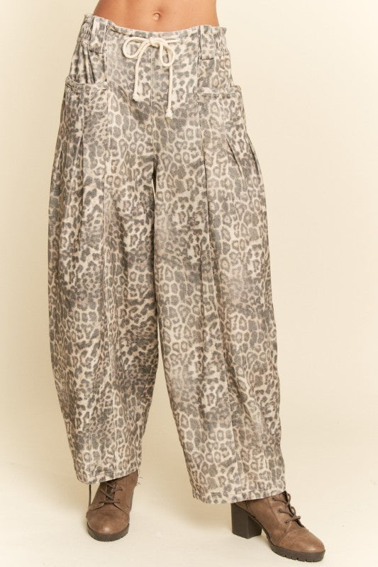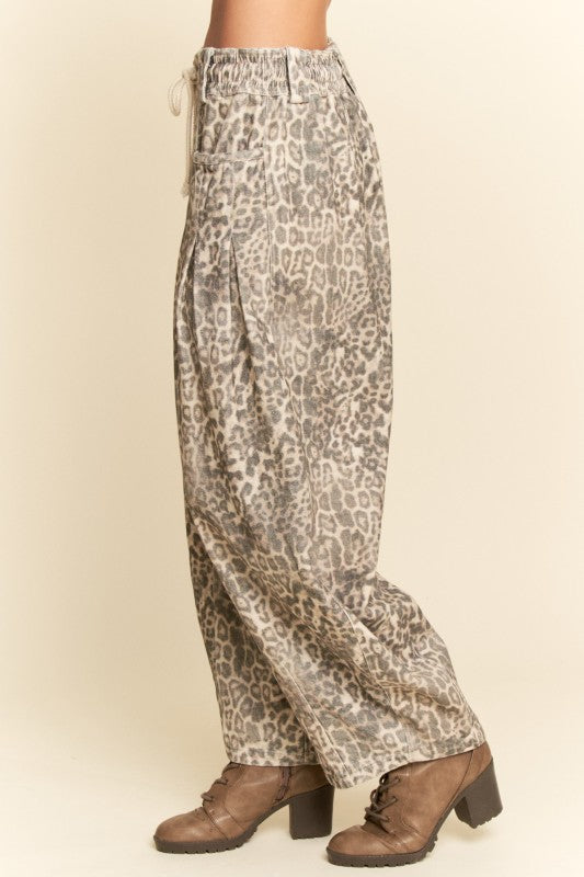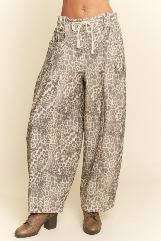 Effortless style meets comfort in these washed leopard denim barrel jeans. Featuring an elastic waistband with adjustable drawstring tie, they deliver a relaxed fit that moves with you. The distinctive leopard print adds edge to any casual look, while the pull-on design makes getting dressed quick and easy. Perfect for laid-back days when you want to look put-together without the fuss.